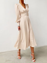 V-neck Lantern Sleeves Ruched Waist Maxi Dress