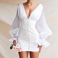 Solid V neck Lantern Sleeves Bodycon Mini Dress