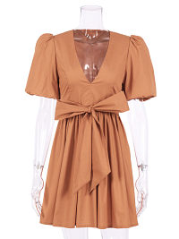 V-Neck Mini Smoke Dress With Bow On Waist